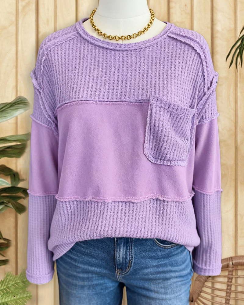 Mint Boutique Patchwork Waffle Boyish Round Neck Drop-Shoulder Shirt