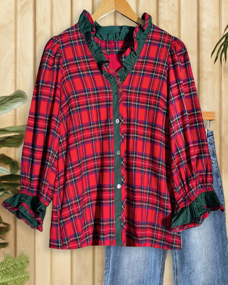 Classic plaid V-neck blouse with button-up design, perfect for everyday wear.