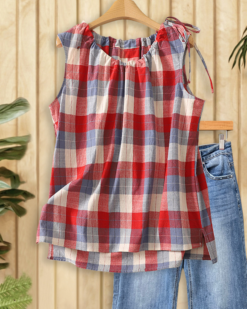Cozy plaid round neck sleeveless shirt with drawstring, perfect for layering, casual outings, or relaxed days.