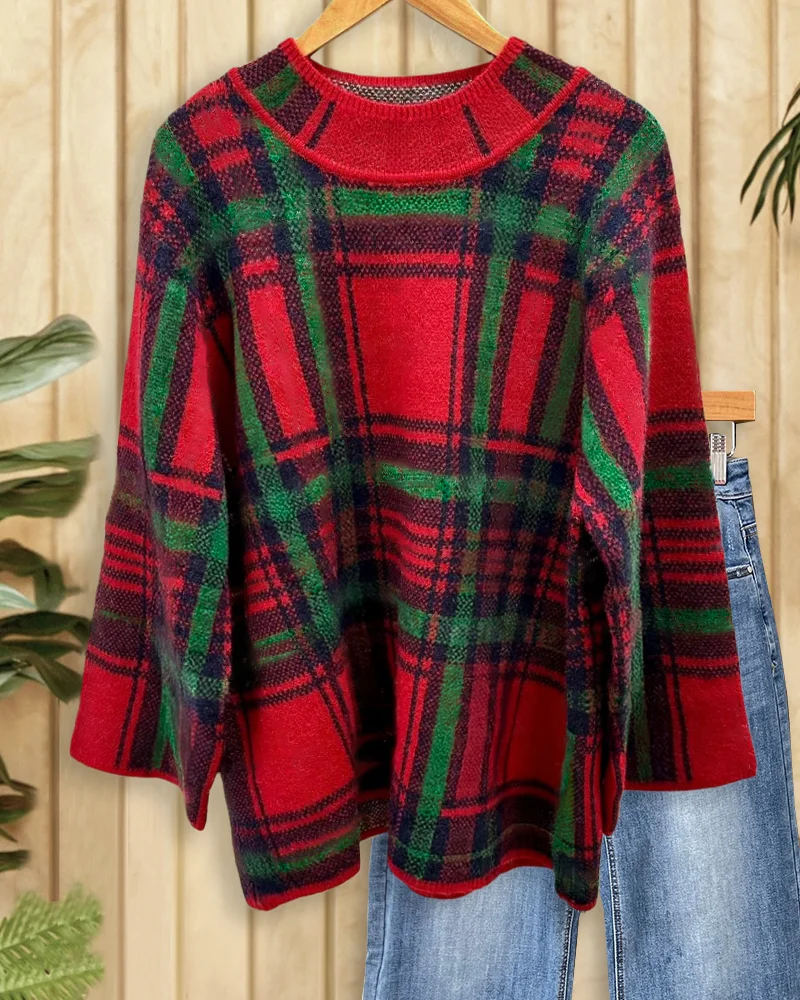 Stylish plaid sweater with mock neck, perfect for cozy everyday wear.