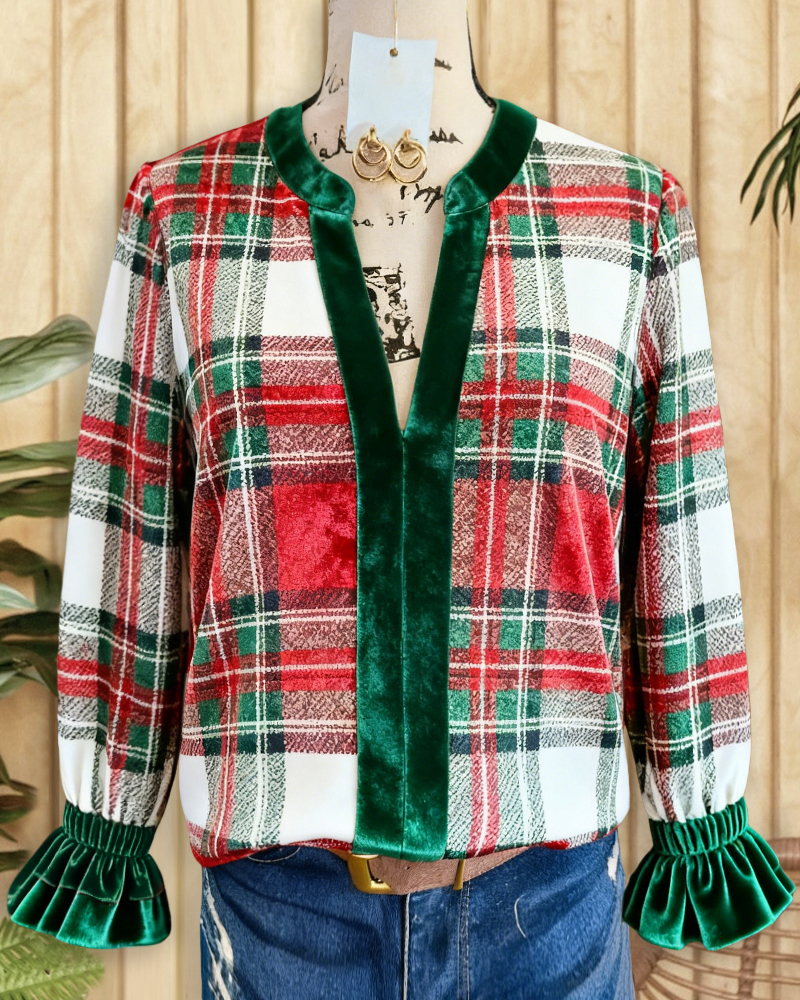 Mint Boutique Plaid Velvet Elegant V Neck Blouse