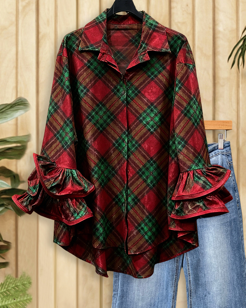 Stylish plaid velvet button-up blouse with ruffle sleeves, perfect for work, dates, and elegant everyday wear.