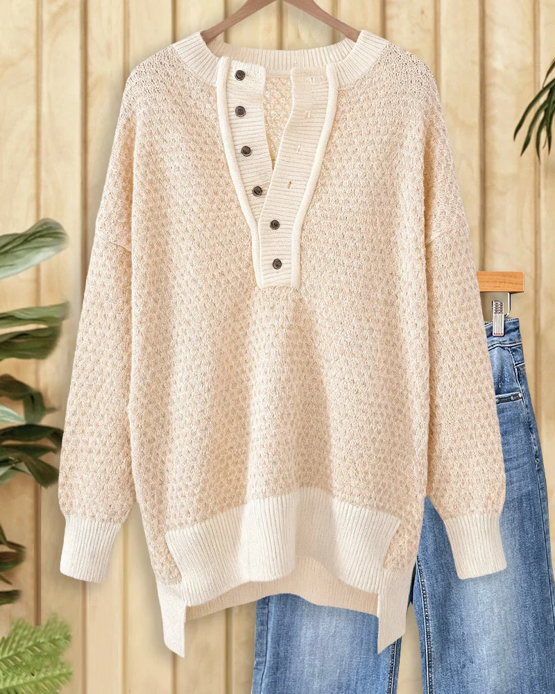 Oversized high-low sweater with point knitting and drop shoulders, perfect for cozy layering.