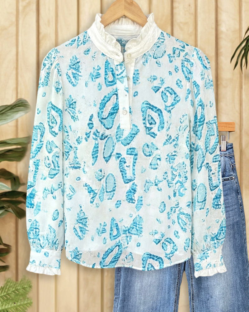 Lightweight white blouse with soft blue abstract leopard print, ruffled collar and cuffs, relaxed fit, chic and effortless for everyday wear.