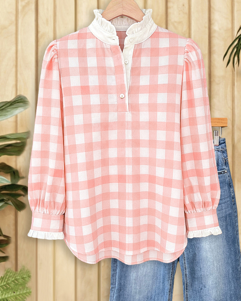 Pink checkered shirt with white ruffled trim, puff sleeves—fresh retro, ideal for spring-summer casual looks.