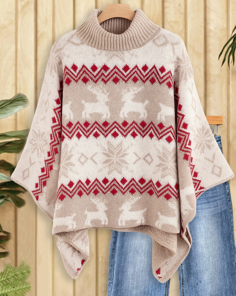 Cozy turtle neck sweater with reindeer design and floaty batwing sleeves, perfect for festive wear.