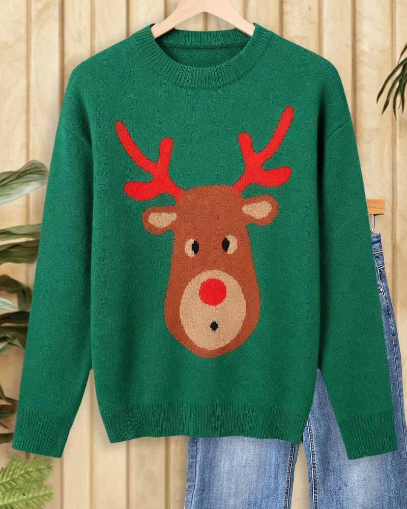 Urban round-neck drop-shoulder sweater with reindeer print, perfect for festive casual wear and cozy holiday style.