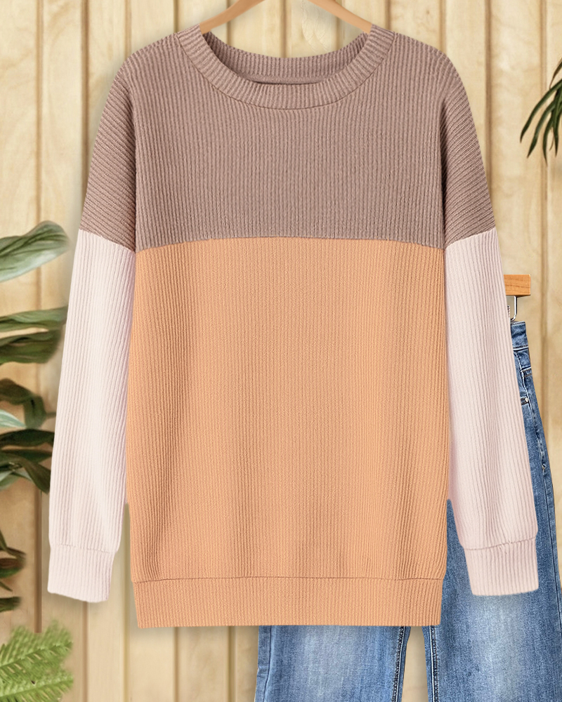 Color-block ribbed sweatshirt with a round neck, perfect for relaxed everyday wear.