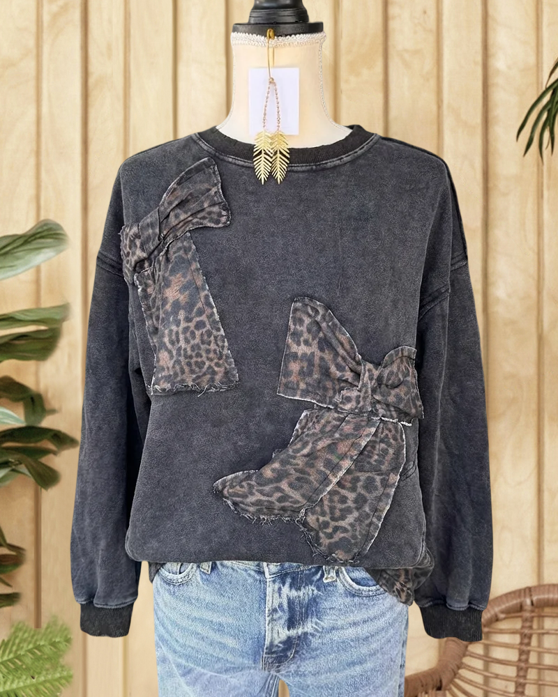 Mint Boutique Round Neck Long Sleeve Applique Leopard Print Bows Simple Sweatshirt
