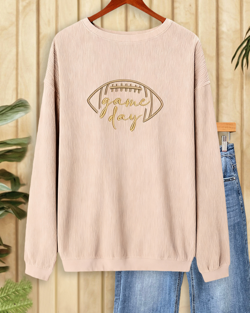 Sporty ribbed round-neck sweatshirt with rugby-inspired embroidery, perfect for casual outings and athletic everyday style.