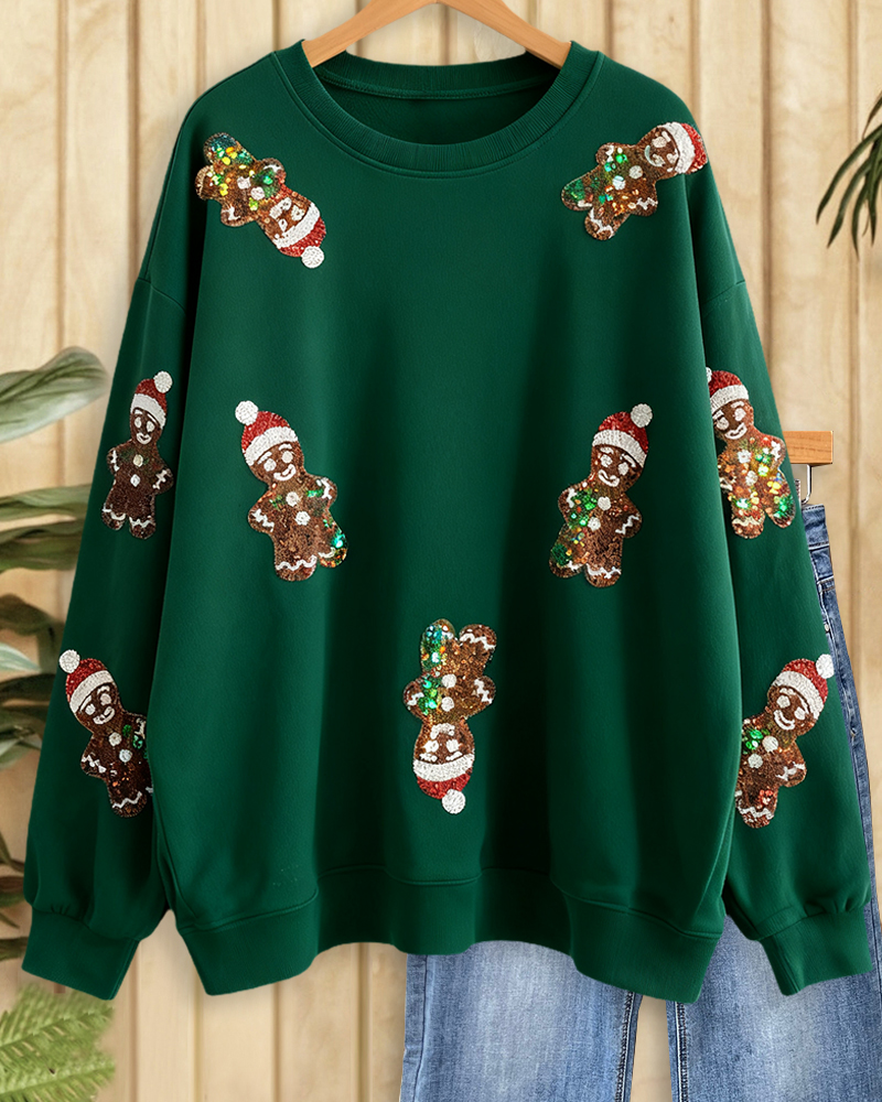 Adorable drop-shoulder sweatshirt with sequined gingerbread man, perfect for festive days.