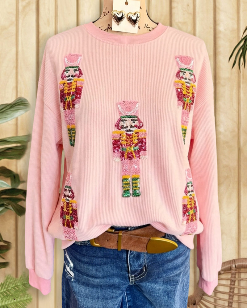 Relaxed drop-shoulder sweatshirt with sequined nutcracker design, perfect for festive holiday wear.