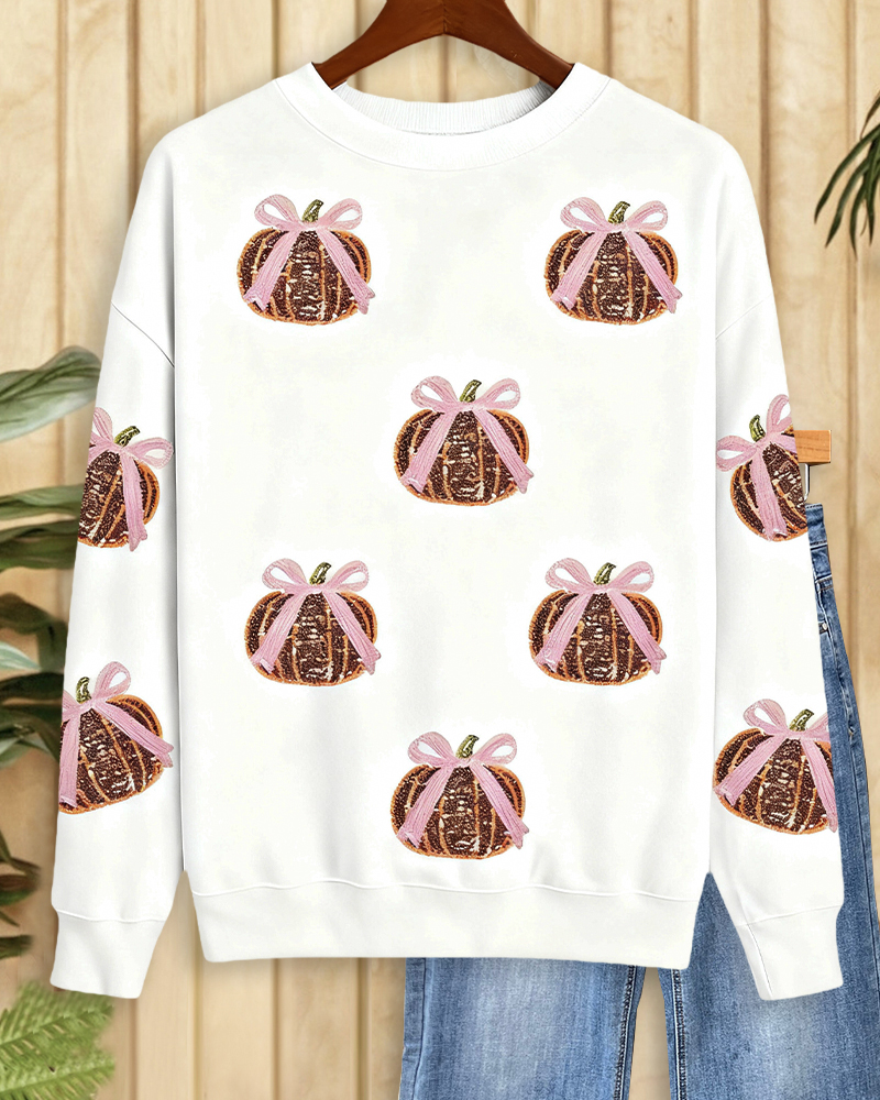 Festive round-neck sweatshirt with sequined pumpkin, perfect for Halloween parties and cozy autumn wear.