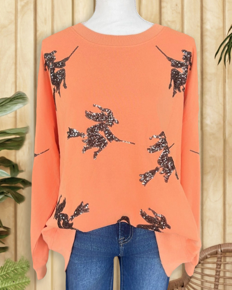 Playful round-neck sweatshirt with sequined sorceress design, perfect for festive and fun occasions.