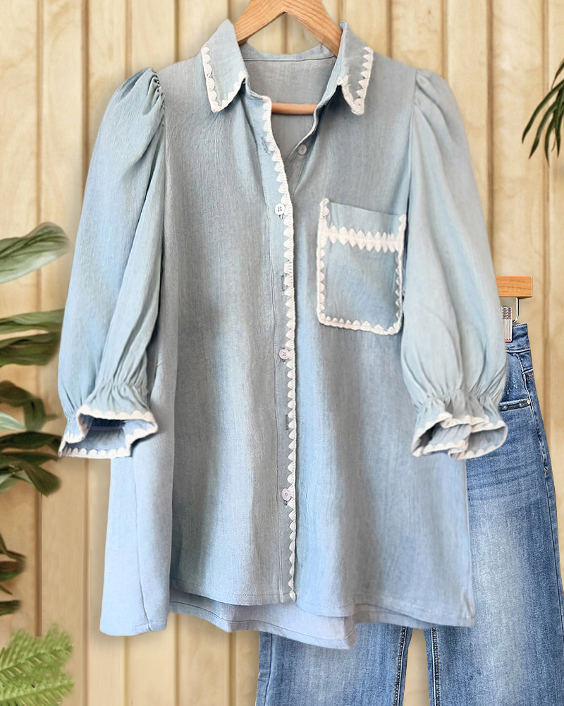 Button-up shirt with shell stitch trim and hit-color design, chic for casual or office wear