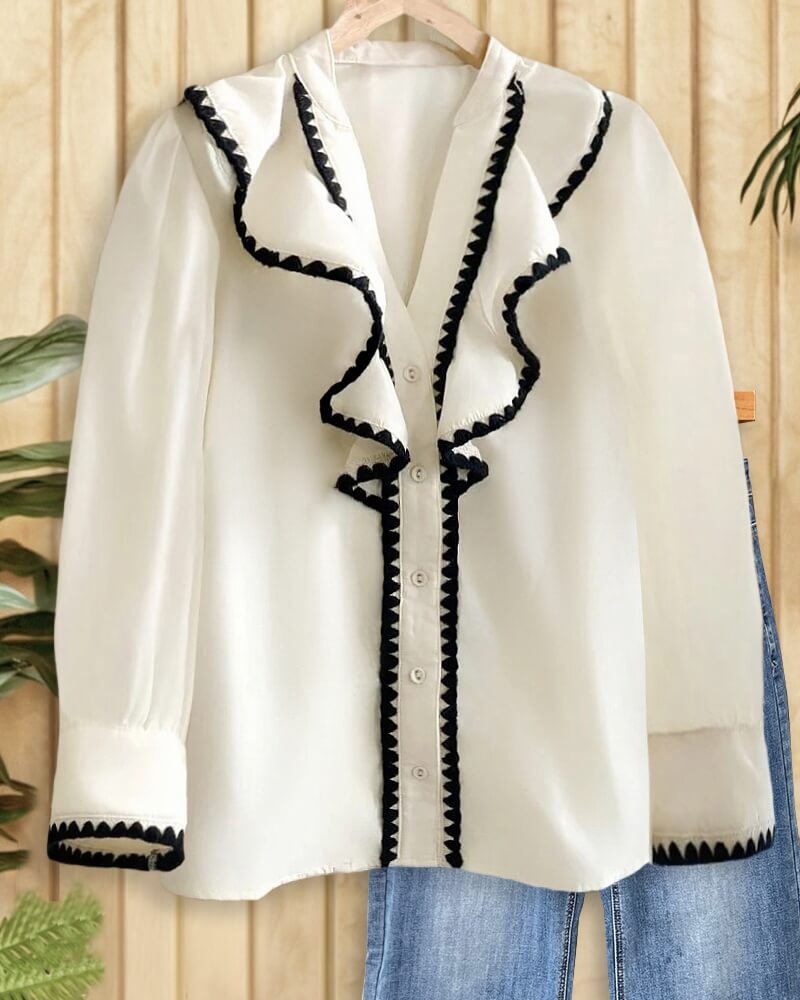 Elegant button-front blouse with shell stitch trim, hit color, and ruffle details, perfect for chic office or casual wear.