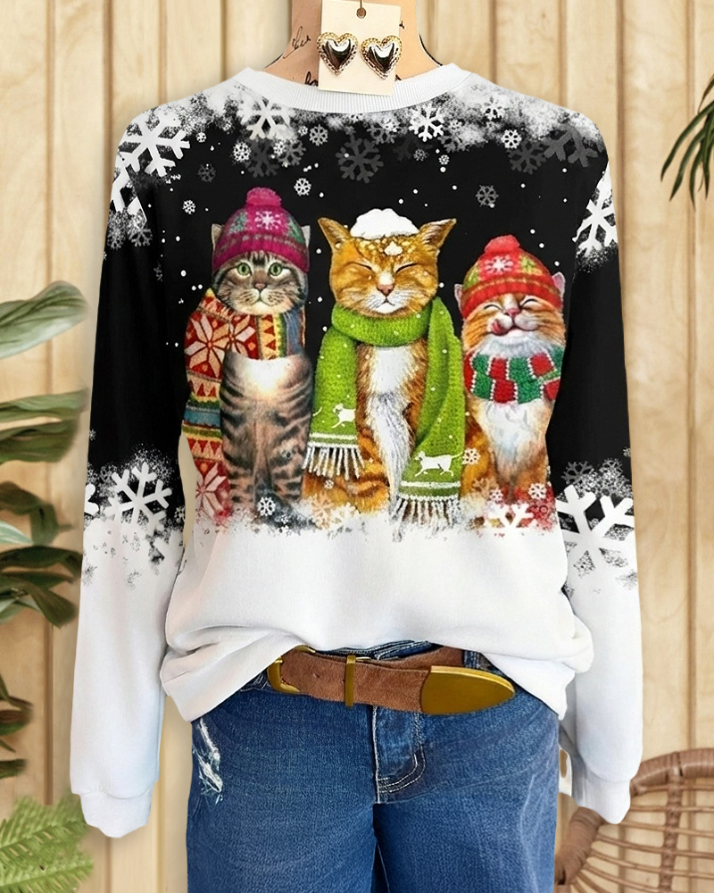 Feminine round-neck shirt with snowflake and cat print, perfect for cute and cozy casual wear.