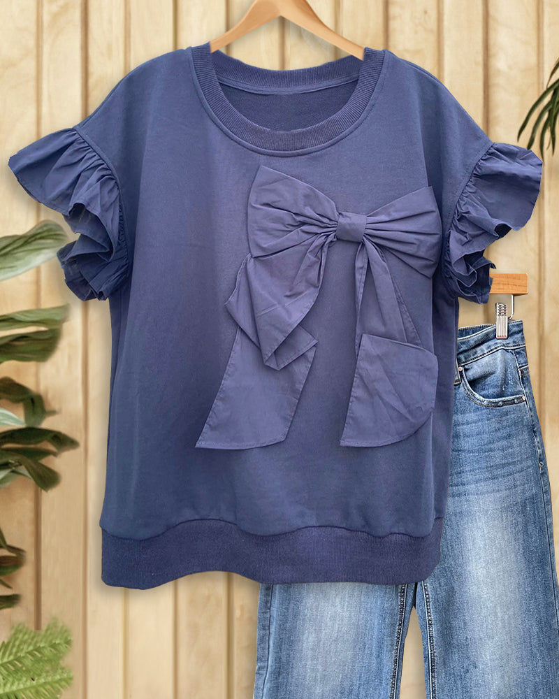 Playful ruffle sleeve t-shirt with bow decoration in solid color.