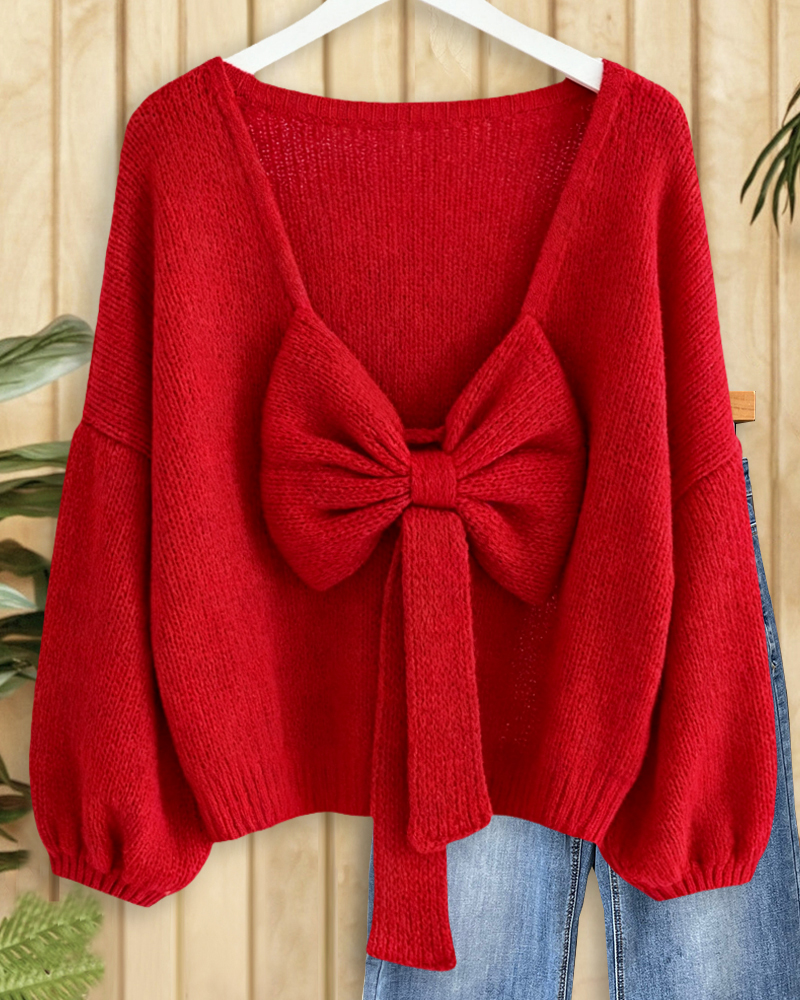 Chic solid-color sweater with back bow and drop shoulders, perfect for stylish casual looks.