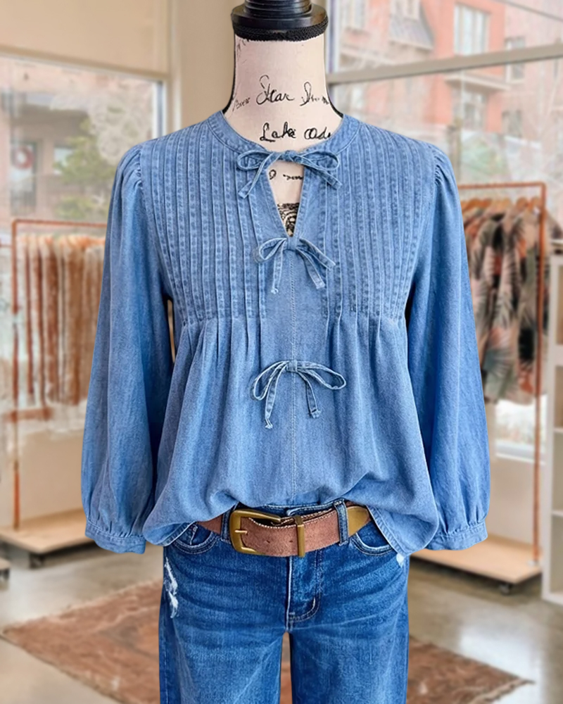 Solid denim blouse with bow tie and pleats, perfect for cute casual everyday wear.