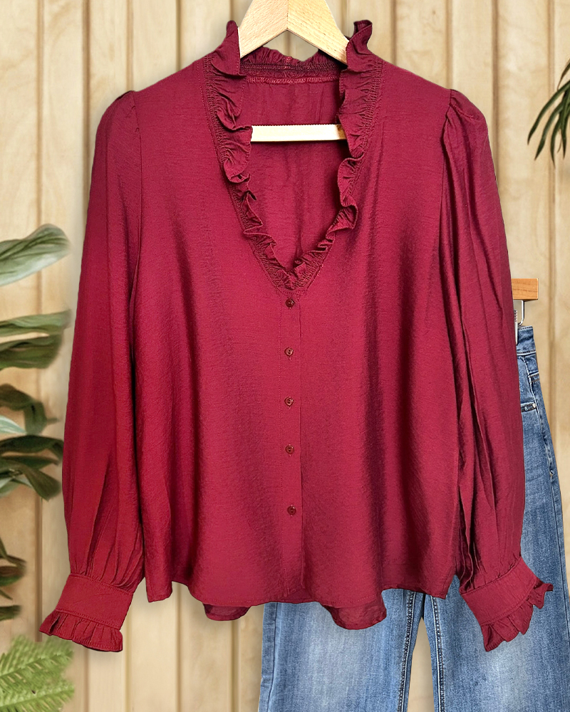 Mint Boutique Solid Color Elegant V Neck Button Up Blouse