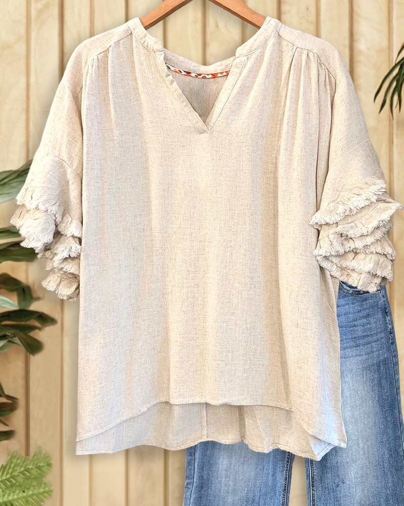 Laid-back solid blouse with frayed ruffle sleeves, perfect for relaxed everyday wear.