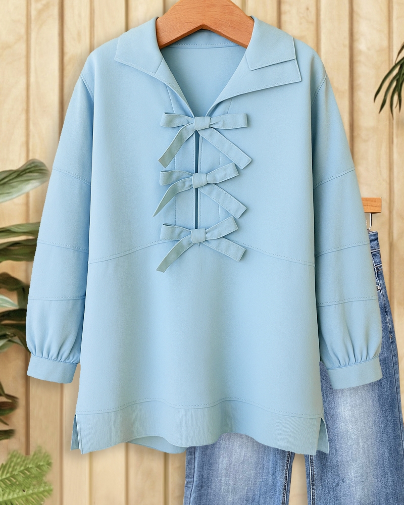 Girly solid sweatshirt with bow decor and seamed details, perfect for casual everyday wear.