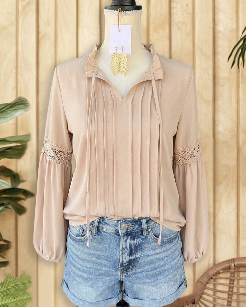 Mint Boutique Solid Color Lace Insert Modern Tie Neck Pleated Detail Blouse
