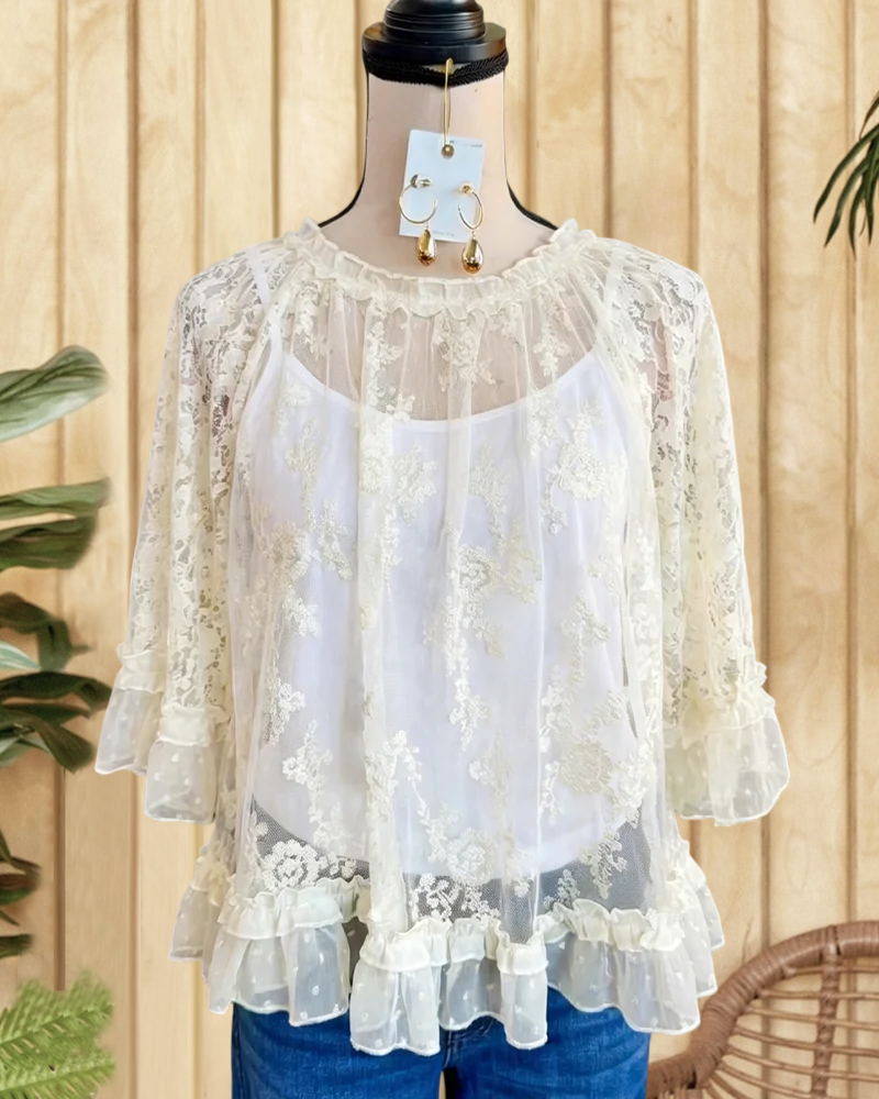 Mint Boutique Solid Color Lace See-Through Floaty Ruffles Decor Blouse