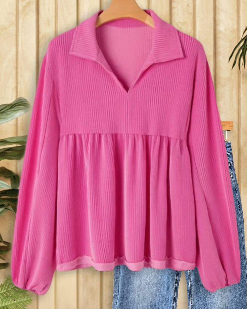 Feminine solid color ribbed V-neck sweatshirt, perfect for cozy and chic daily wear.