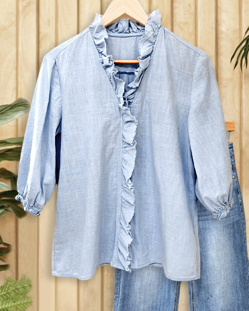 Mint Boutique Solid Color Ruffles Trim V Neck Hidden Button Versatile Blouse