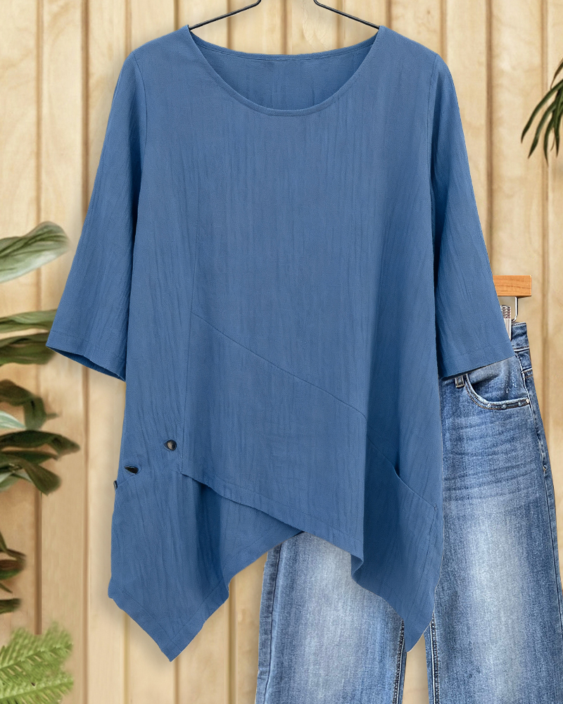 Minimalist solid blouse with an irregular hem, ideal for modern everyday styling.