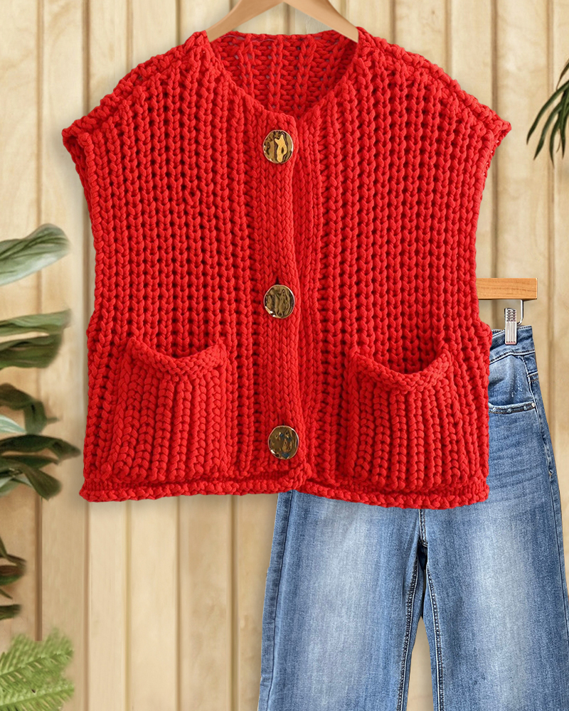 Cozy solid color sleeveless cardigan with button-up front, perfect for layering in casual outfits.