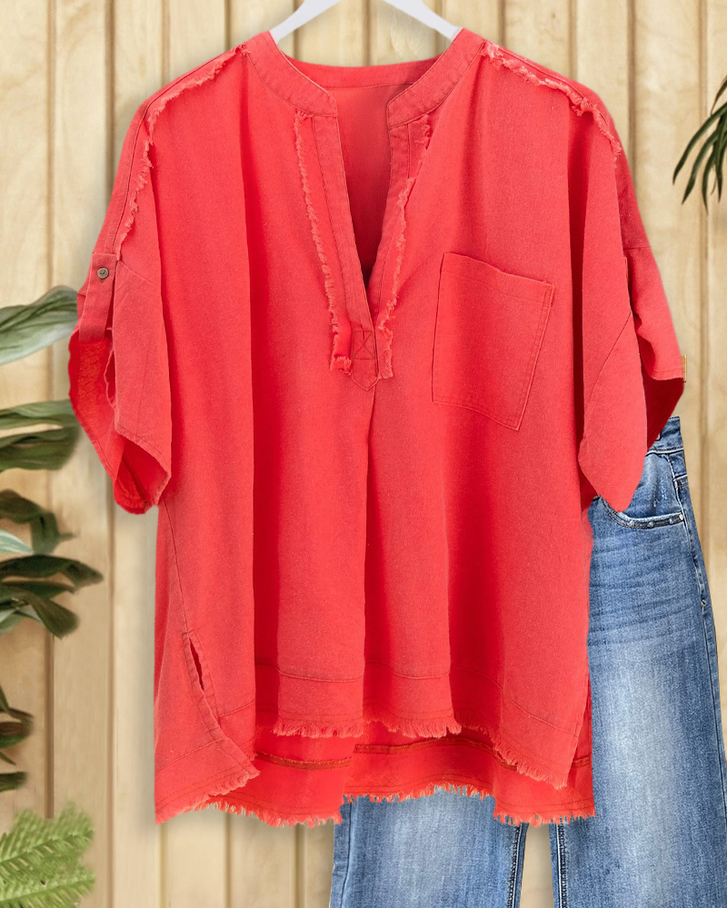 Mint Boutique Solid Color V Neck Simple Frayed Shirt