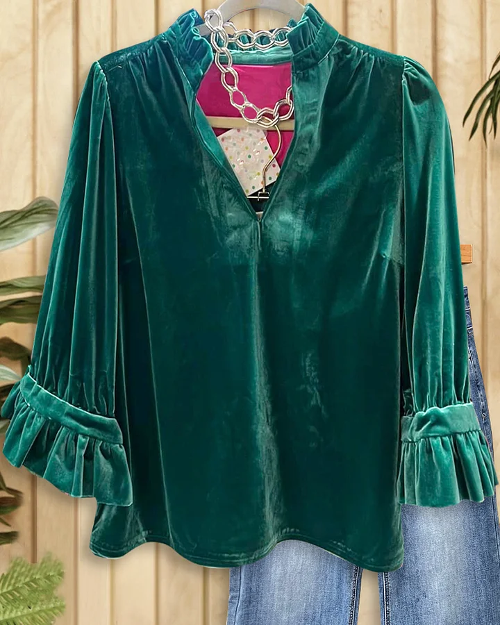 Elegant velvet blouse in solid color with ruffle sleeves, perfect for a chic and sophisticated look.