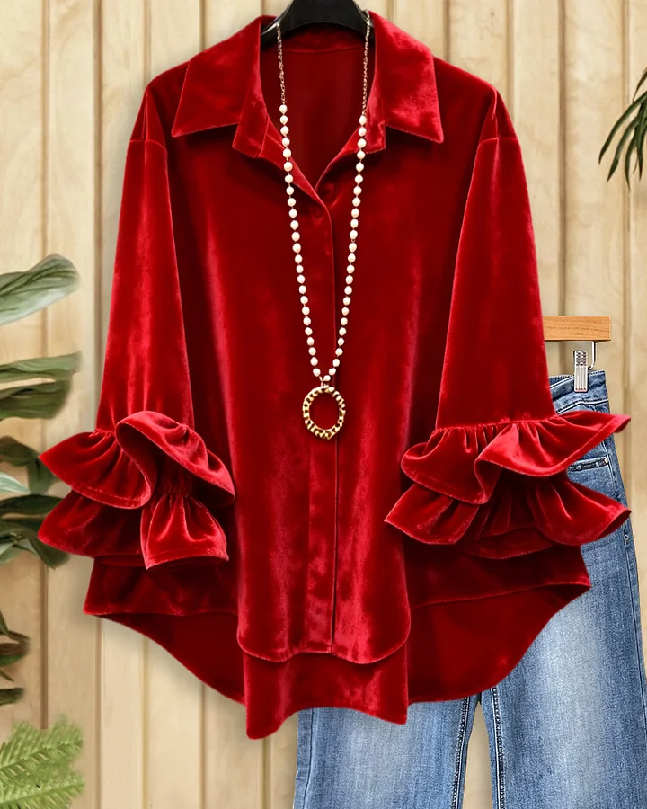 Glamorous solid velvet button-up blouse with ruffle sleeves, perfect for elegant occasions.