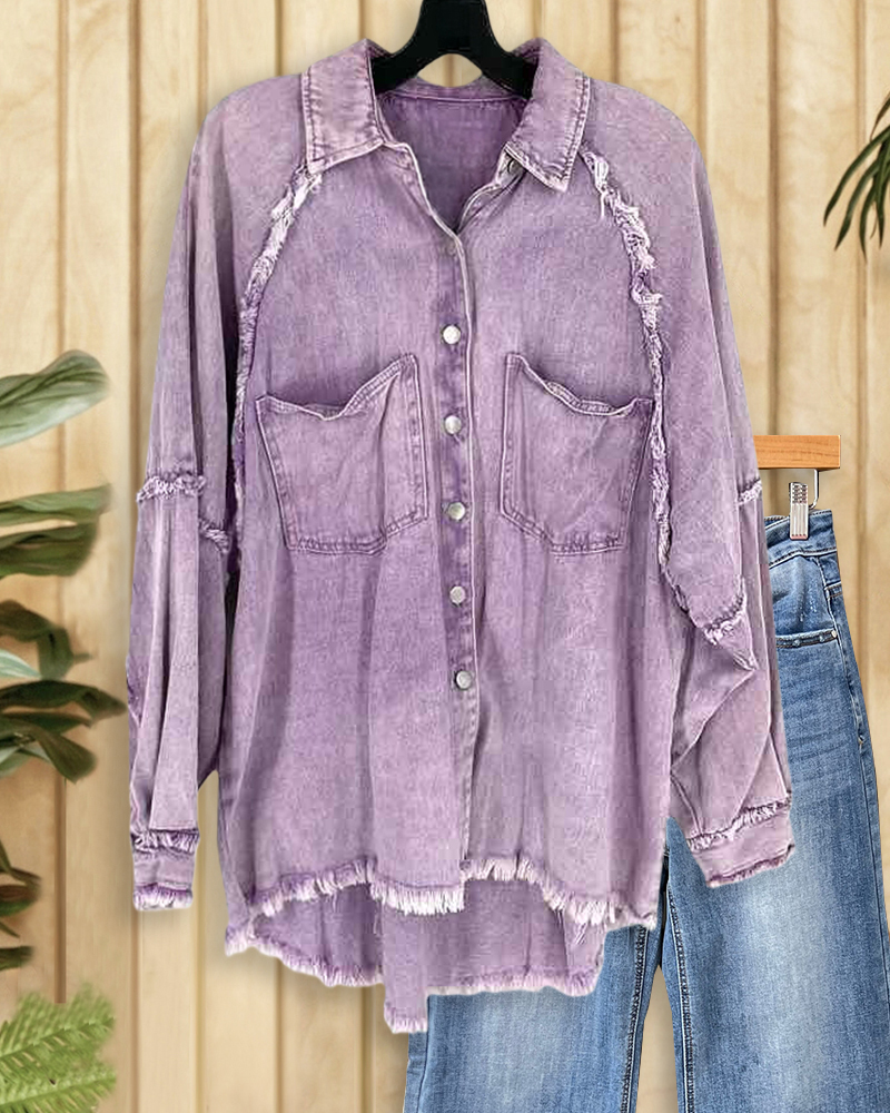 Mint Boutique Solid Color Washed Denim On-trend Button Up Frayed Jacket