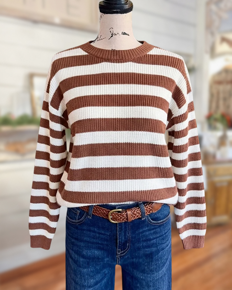 Striped round neck sweater with drop-shoulder fit, perfect for classic casual wear.
