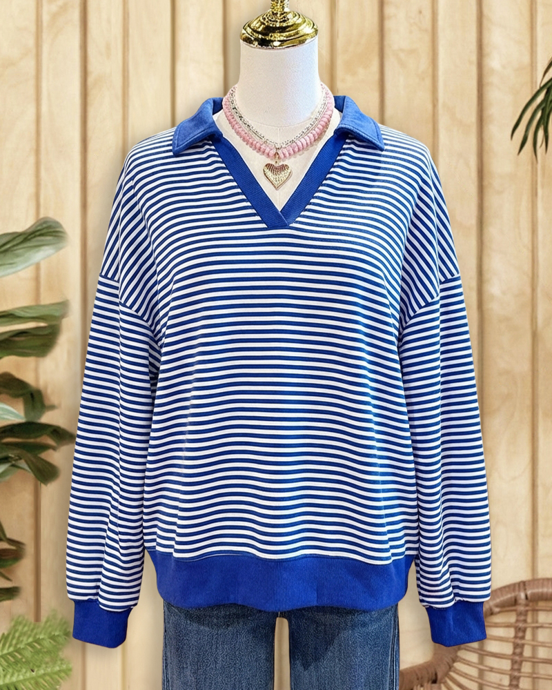 Classic striped drop-shoulder shirt with a V-neck, perfect for casual wear.