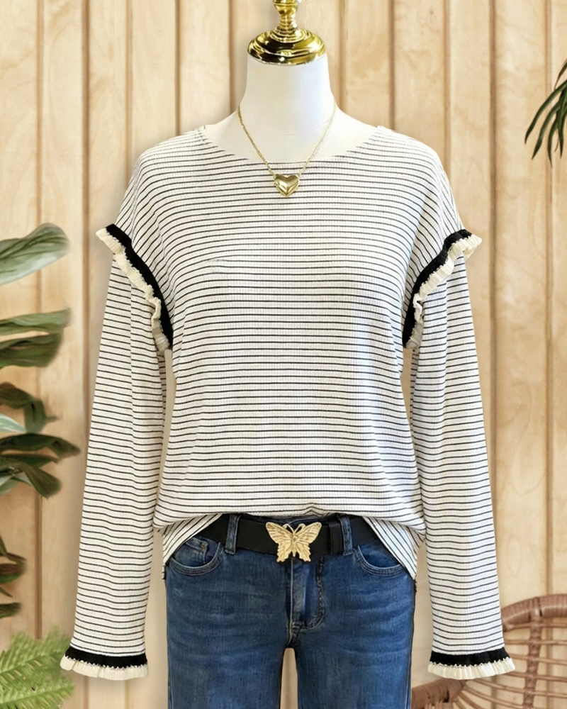 Mint Boutique Striped Cute Ruffles Decor Round Neck Blouse
