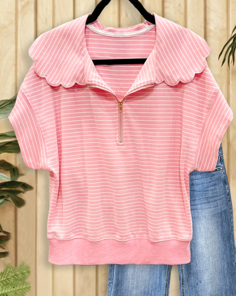 Charming scalloped collar with stripes, perfect for casual chic looks.
