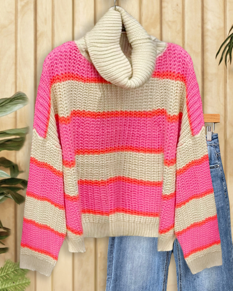 Classic striped sweater with high neck and drop shoulders, perfect for everyday wear.