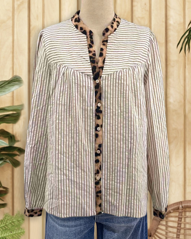 Wild button-up blouse with striped and leopard print mix, perfect for bold everyday wear.