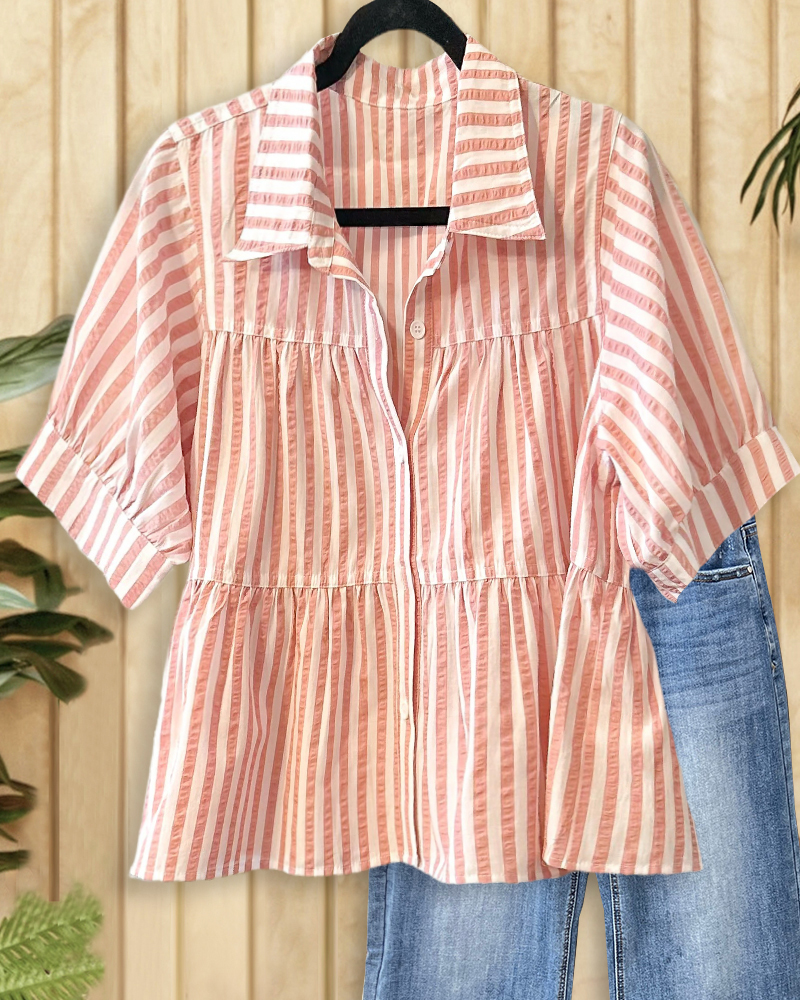 On-trend striped button-up blouse with tiered design, perfect for stylish everyday looks.