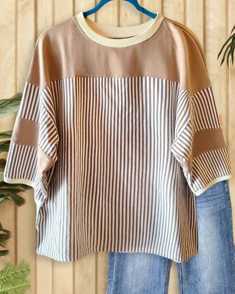 Casual round neck sweatshirt with striped patchwork, perfect for everyday relaxed wear.