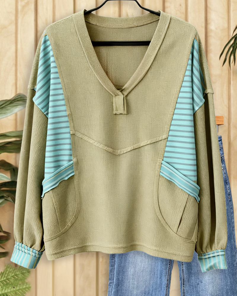 Cozy V neck sweatshirt with striped patchwork and pockets, perfect for casual daily wear.