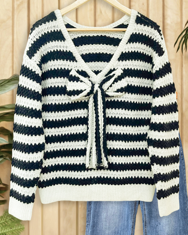 Pretty striped sweater with back bow and drop shoulders, perfect for cute casual wear.