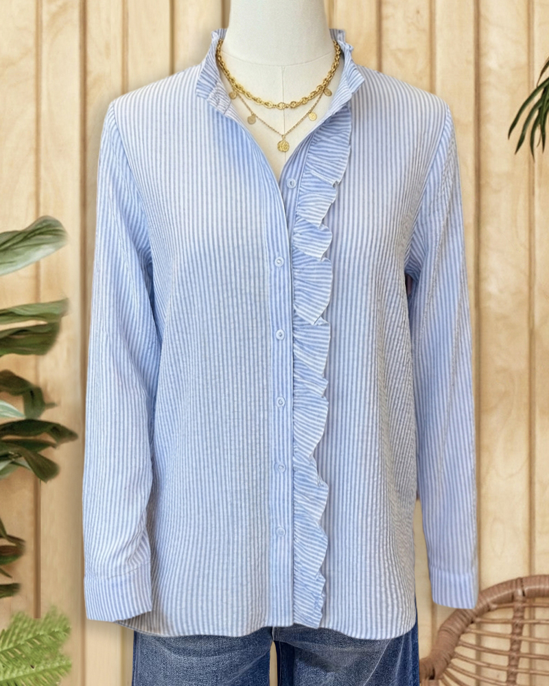 Pretty striped button-up blouse with ruffle details, perfect for feminine everyday or office wear.
