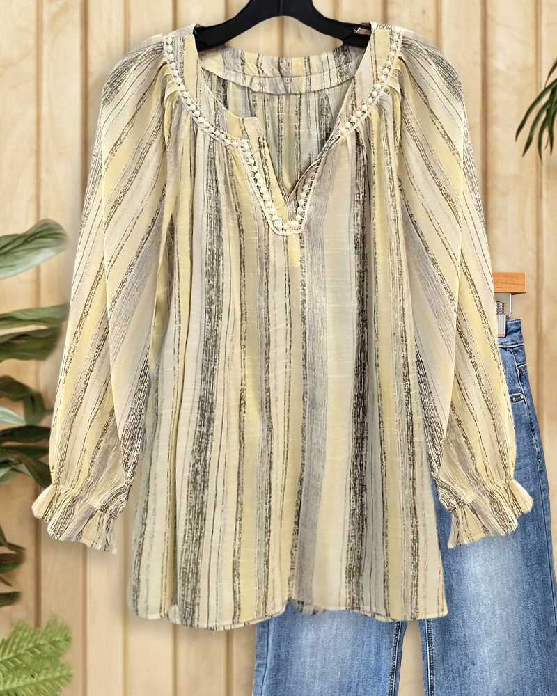 Retro striped blouse with lacy decor and split neck, perfect for elegant casual wear.
