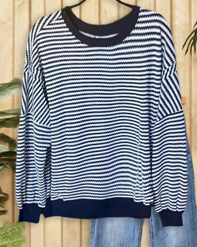 Oversized striped sweatshirt with round neck and side slits, perfect for relaxed casual wear.